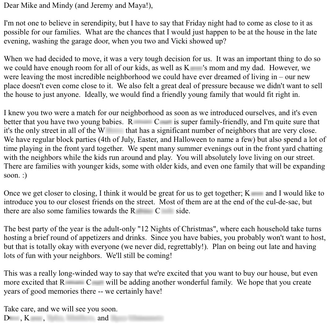 On Monday, Vickie emailed to tell us that after reading this letter from the seller, she was absolutely certain this is the perfect home for our family. For security reasons, I edited out some names.